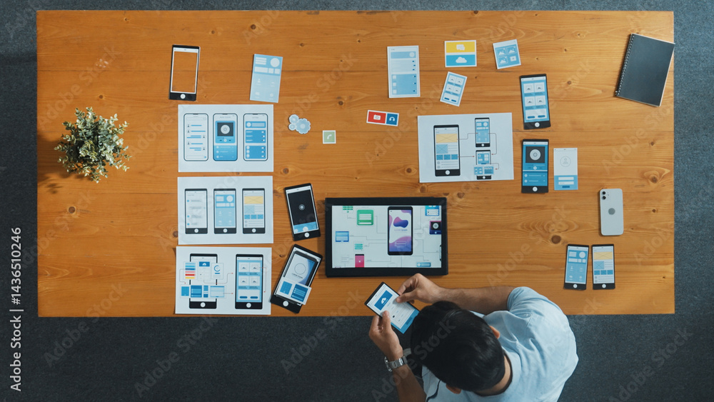 The watermark will not be included on Wall mural.: Top view of skilled developer walking and placing ux ui software - smart business man put tablet on m