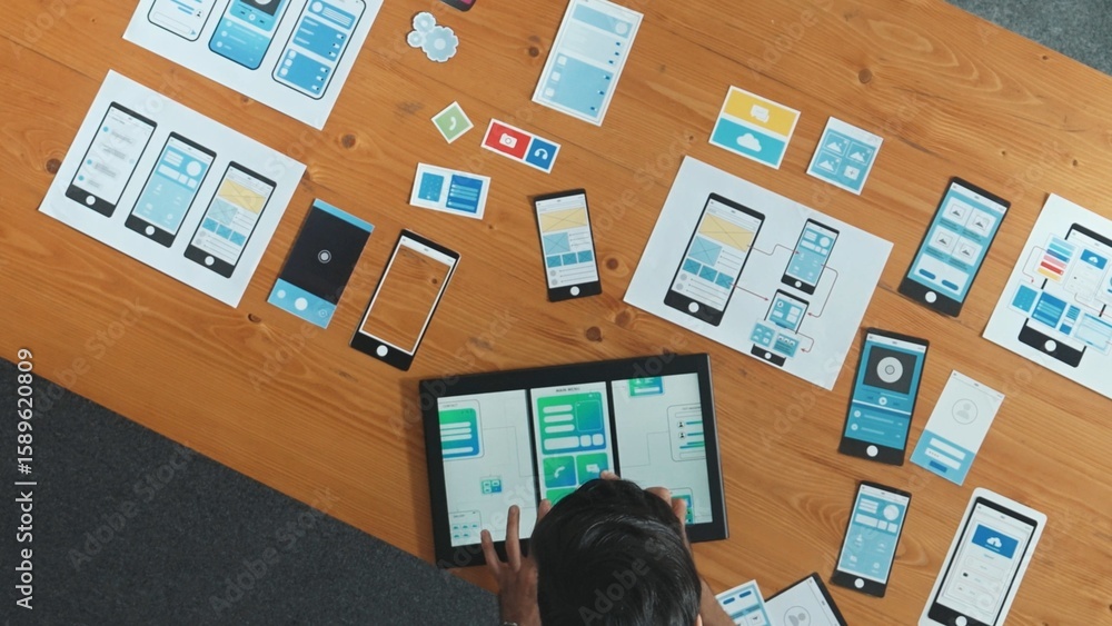 The watermark will not be included on Wall mural.: Top view of skilled developer walking and placing ux ui software - smart business man put tablet on m