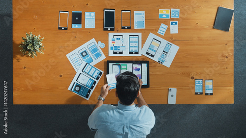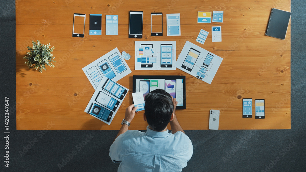 The watermark will not be included on Wall mural.: Top view of skilled developer walking and placing ux ui software - smart business man put tablet on m