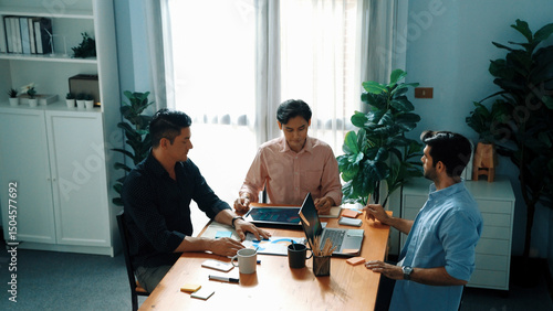 The watermark will not be included on Wall mural.: Top view of team working together to brainstorm idea while project manager talking to phone at meeti