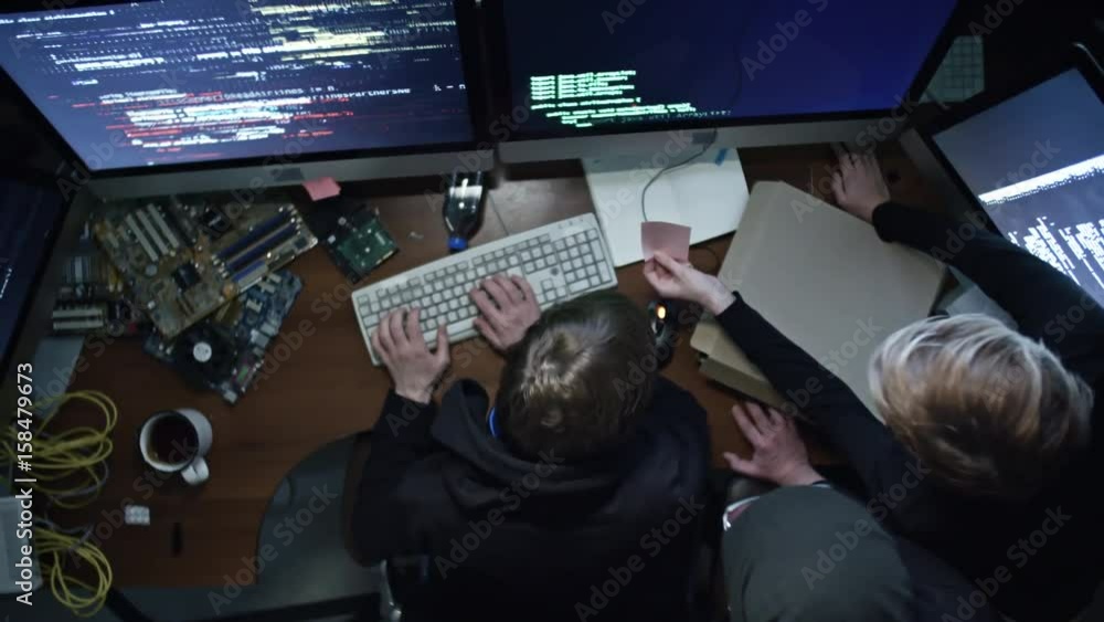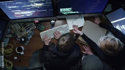 Wall mural top view of three hackers working with programming code on computers in dark office