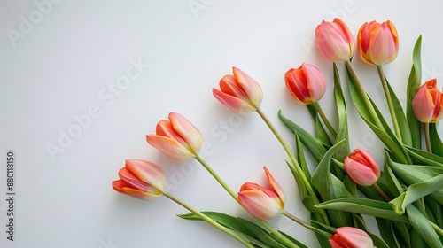 The watermark will not be included on Wall mural.: Top view of tulip flowers on white table with space for text