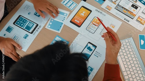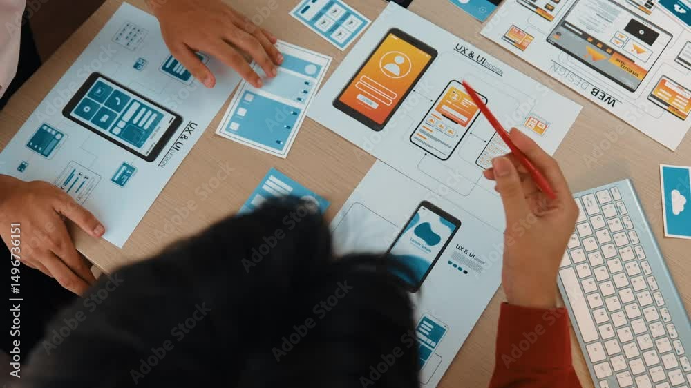 The watermark will not be included on Wall mural.: Top view panorama video of startup company employee planning on user interface prototype for mobile