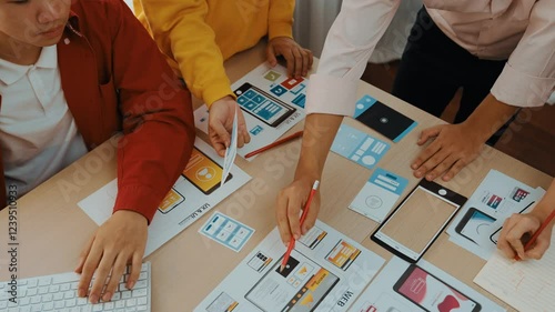 The watermark will not be included on Wall mural.: Top view panorama video of startup company employee planning on user interface prototype for mobile
