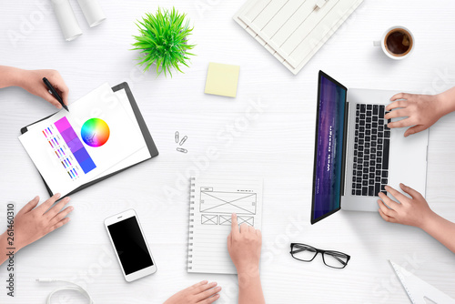 Wall mural top view scene of web design team work desk. laptop computer with flat design web site concept, idea - Wall murals Wall mural top view scene of web design team work desk. laptop computer with flat design web site concept, idea - Wall murals