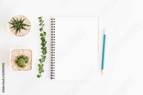 Top view white notebook with cactus on white background, flat lay photo and copy space for designWall mural