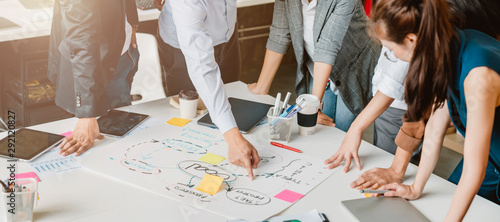 Wall mural : Topview of creative agency business brain storm meeting presentation team discussing roadmap to prod