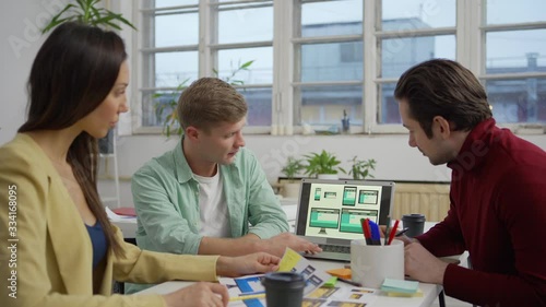 Wall mural tracking medium shot of team of three young marketing specialists and designers sitting at table in