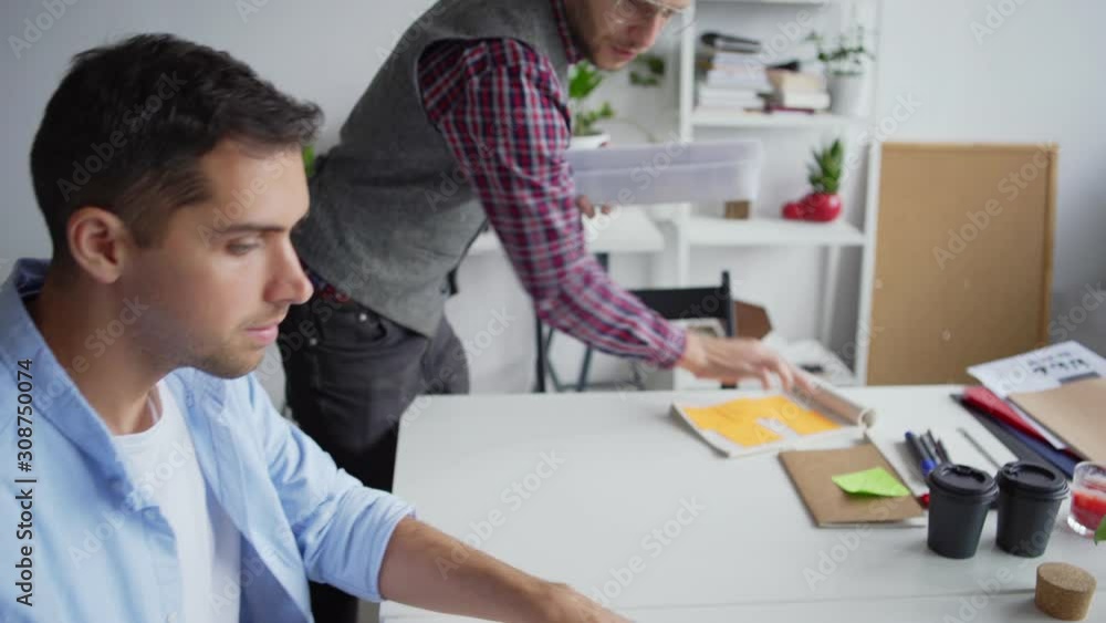 Wall mural tracking tilt down closeup shot of web designer unrolling paper and showing printed website interfac - Wall murals Wall mural tracking tilt down closeup shot of web designer unrolling paper and showing printed website interfac - Wall murals