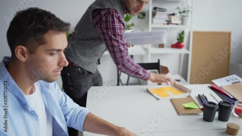 Wall mural : Tracking tilt down closeup shot of web designer unrolling paper and showing printed website interfac