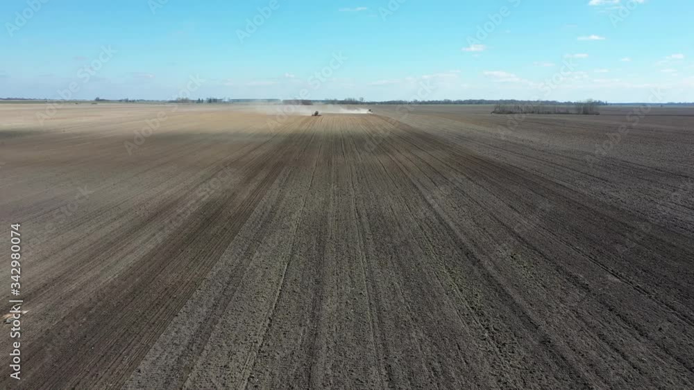 Wall mural tractor in the dust working in the field. tractor with a modern sowing seeds machine in a newly plow - Wall murals Wall mural tractor in the dust working in the field. tractor with a modern sowing seeds machine in a newly plow - Wall murals