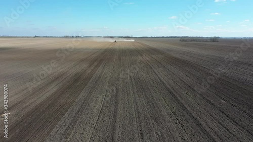 Tractor in the dust working in the field - tractor with a modern sowing seeds machine in a newly plowWall mural