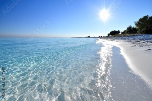 Wall mural : Tranquil sandy beach with clear blue waters under a bright sun