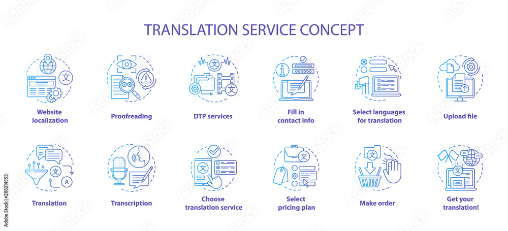 Wall mural translation service blue concept icons set. foreign language translation idea thin line illustration - Wall murals Wall mural translation service blue concept icons set. foreign language translation idea thin line illustration - Wall murals