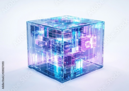 The watermark will not be included on Wall mural.: Transparent cube with glowing internal circuitry -