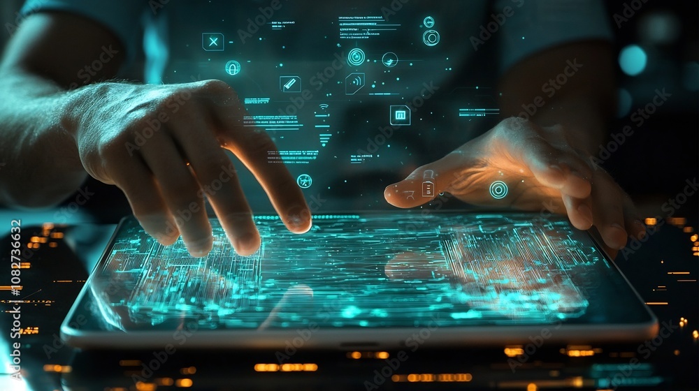 Wall mural : Transparent tablet with glowing holographic buttons and floating notifications technology concept