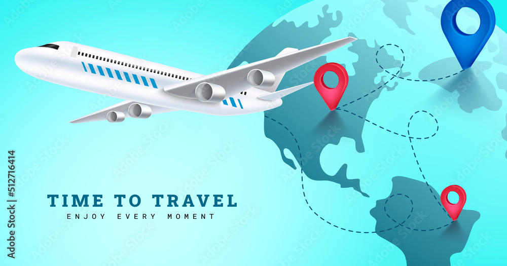 Travel time vector background design - time to travel text with airplane flight in different worldwidWall mural