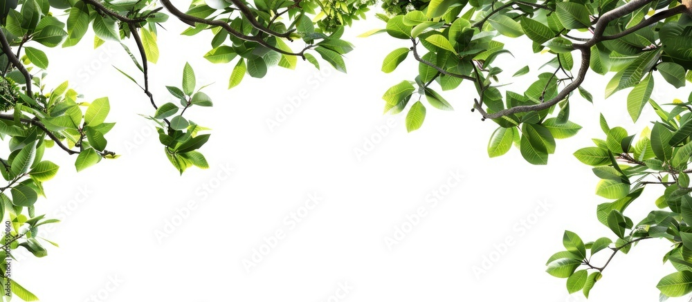 Tree branches with green leaves forming a border against a white background suitable for a copy spacWall mural