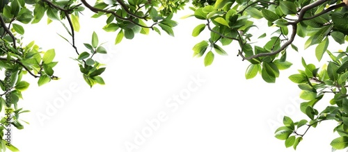The watermark will not be included on Wall mural.: Tree branches with green leaves forming a border against a white background suitable for a copy spac