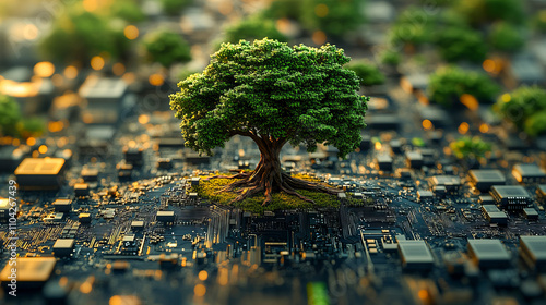Wall mural tree growing on microchip circuit board representing technology and nature integration - Wall murals Wall mural tree growing on microchip circuit board representing technology and nature integration - Wall murals