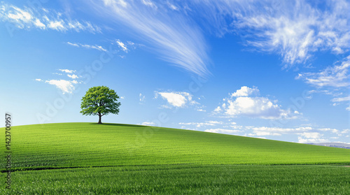 The watermark will not be included on Wall mural.: Tree is standing in a grassy field with a clear blue sky above it