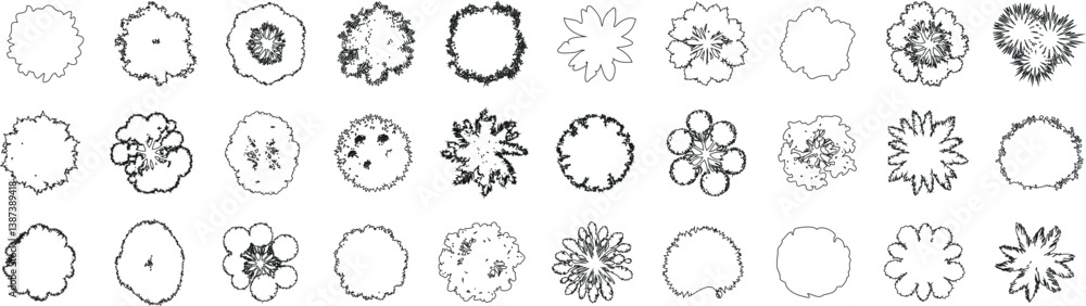 The watermark will not be included on Wall mural.: Tree top view line art illustration set featuring diverse hand drawn tree shapes - ideal for landscap