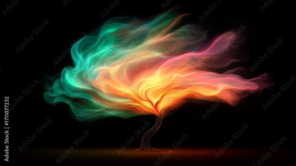 Wall mural tree with a bright orange trunk and green leaves. the tree is surrounded by a dark background - Wall murals Wall mural tree with a bright orange trunk and green leaves. the tree is surrounded by a dark background - Wall murals