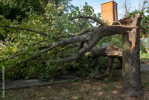 The watermark will not be included on Wall mural.: Trees felled and trunks broken by strong gusts of wind on the city, extensive damage caused by the c
