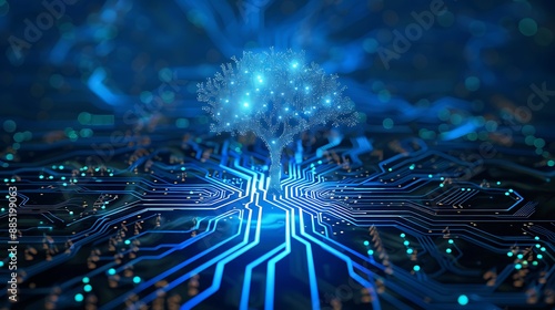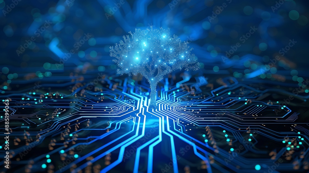 Wall mural trees grow at the convergence point of computer circuit boards with blue light wire frame network te - Wall murals Wall mural trees grow at the convergence point of computer circuit boards with blue light wire frame network te - Wall murals