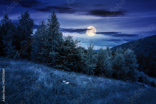Wall mural trees on the hill in summer scenery at night. beautiful mountain landscape in full moon light