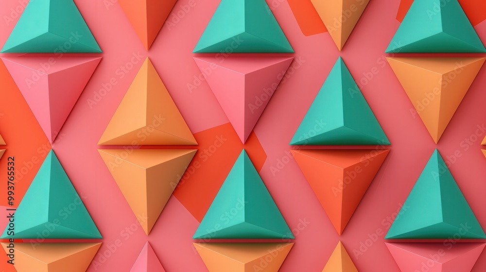 The watermark will not be included on Wall mural.: Triangular harmony, an abstract composition of floating three-dimensional triangles in a vibrant fla
