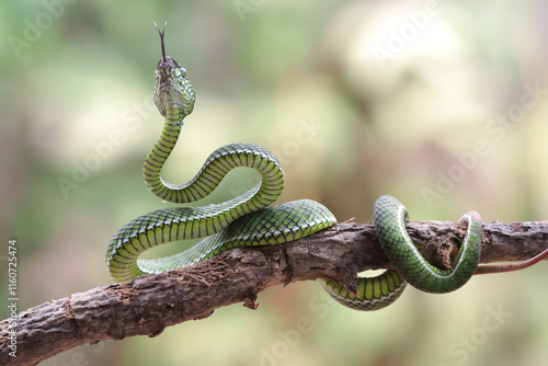 Wall mural : Trimeresurus calamitas with defensive position on branch, trimeresurus calamitas on tree, indonesian