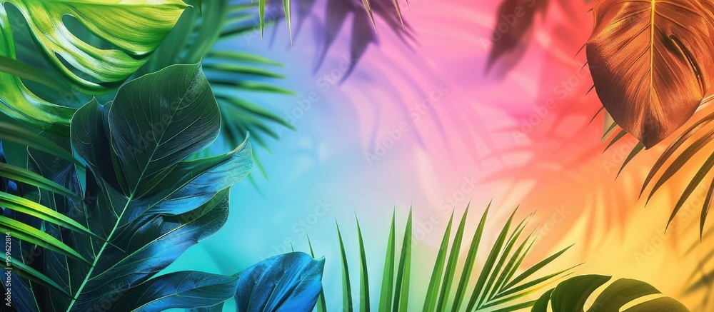 The watermark will not be included on Wall mural.: Tropical leaves on a colored background - copy space image - place for adding text and design