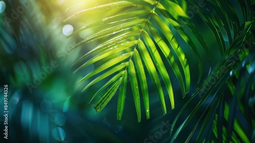 Wall mural : Tropical palm leaf and shadow, abstract natural green - light and shadow on palm leaf, dark blue natu