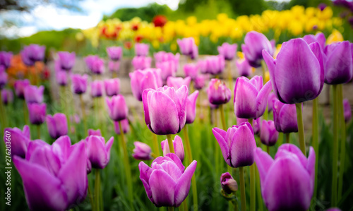 Wall mural tulip field. beautiful blooms from low angle. beautiful spring day with blue sky and white clouds. u