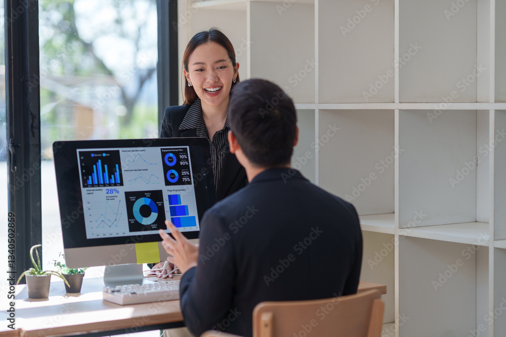 The watermark will not be included on Wall mural.: Two asian businesspeople are discussing business performance using charts and data displayed on a co