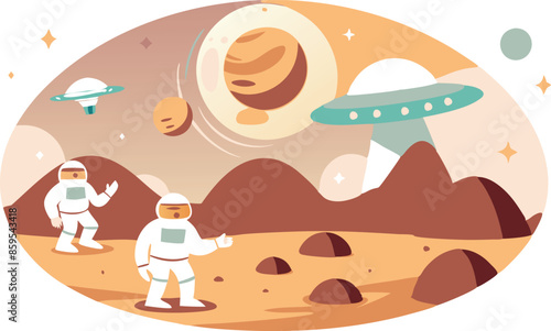 The watermark will not be included on Wall mural.: Two astronauts are walking on a planet with a large planet in the background
