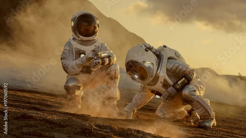 Two astronauts collect soils samples on alien planet, analyzing them with hands computer - mars/ red Wall mural