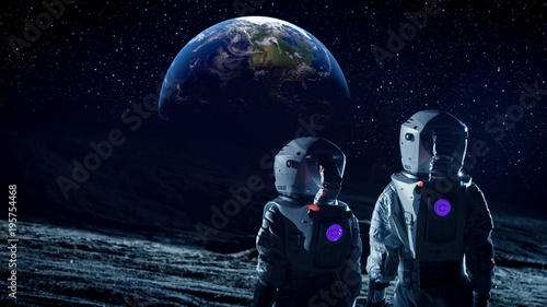 Wall mural two astronauts in space suits standing on the moon and look at beautiful earth in the sky. space tra - Wall murals Wall mural two astronauts in space suits standing on the moon and look at beautiful earth in the sky. space tra - Wall murals