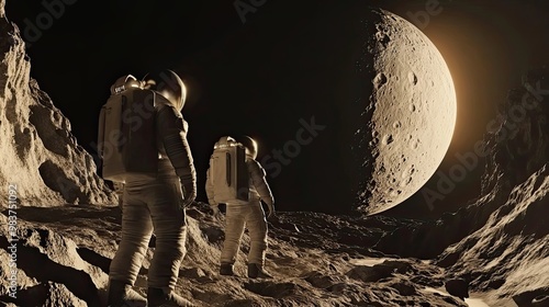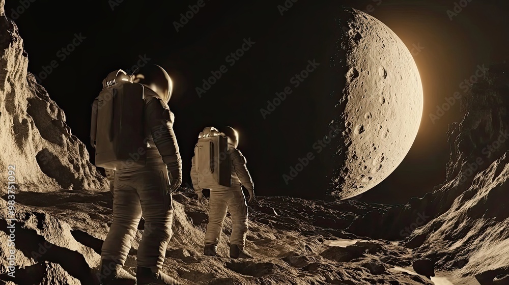 The watermark will not be included on Wall mural.: Two astronauts standing on a moon-like surface with a large cratered celestial body in the backgroun