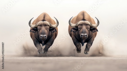 Wall mural two buffaloes charging towards the viewer on a dusty landscape with dust clouds trailing behind them - Wall murals Wall mural two buffaloes charging towards the viewer on a dusty landscape with dust clouds trailing behind them - Wall murals