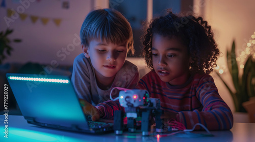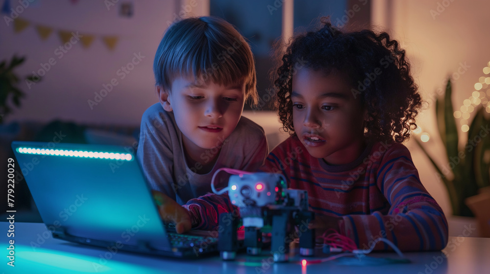 The watermark will not be included on Wall mural.: Two children collaborating on programming their robot on a laptop, their faces lit by the screen's g