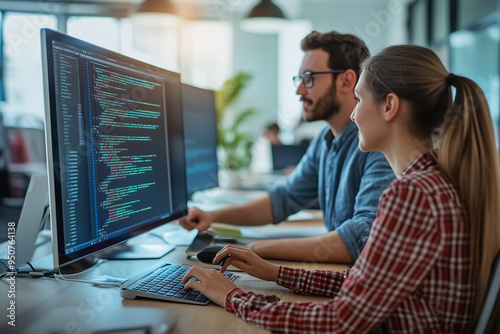 The watermark will not be included on Wall mural.: Two computer programmers working together on code, using a desktop computer in a busy office