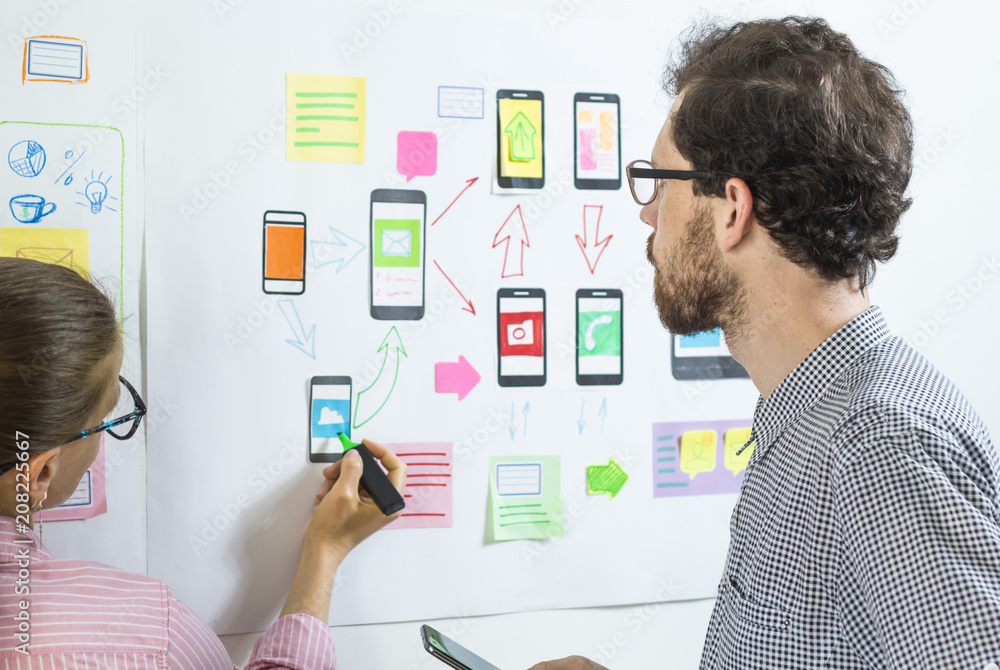 Wall mural two creative web designers are developing mobile applications in the workplace. - Wall murals Wall mural two creative web designers are developing mobile applications in the workplace. - Wall murals