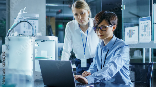 The watermark will not be included on Wall mural.: Two engineers work with three dimensional printer in laboratory