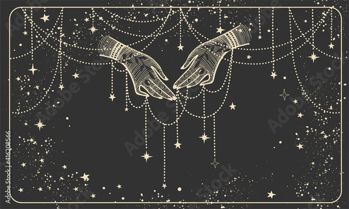 Wall mural two hands with precious threads on a black cosmic background. boho design for palmistry, fortune tel