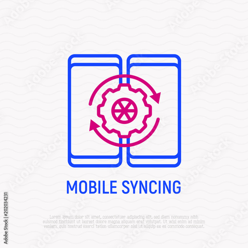 Wall mural : Two mobile devices are syncing - thin line icon - modern vector illustration of data exchange -