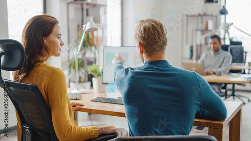 The watermark will not be included on Wall mural.: Two mobile software developers work on desktop computer, they discuss smartphone application design -