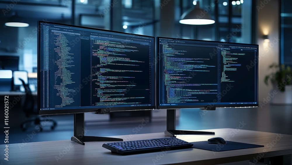 The watermark will not be included on Wall mural.: Two monitors displaying code in a dark office -