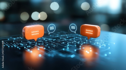 Wall mural two orange speech bubbles filled with asterisks hover above a network of glowing blue lines and dots - Wall murals Wall mural two orange speech bubbles filled with asterisks hover above a network of glowing blue lines and dots - Wall murals